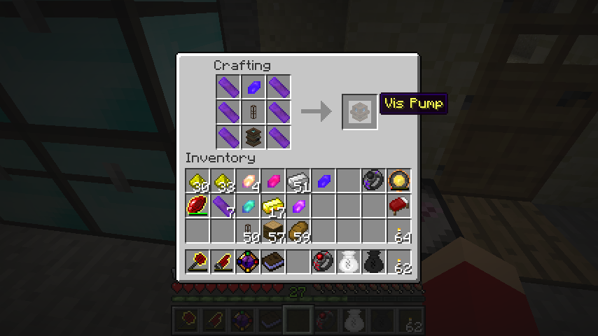 神秘のふいご、魔力を込めた木材*6、導管、Aqueous Crystalで魔力ポンプ(Vis Pump)。
