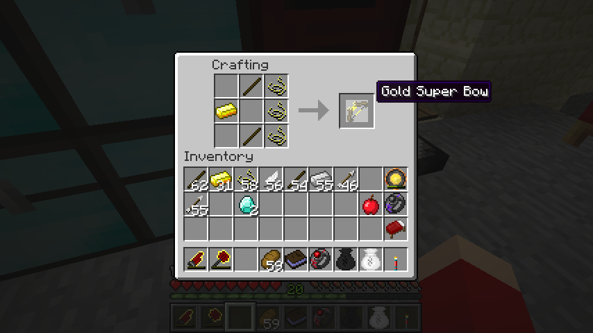 ダイヤモンド、鍛えた棒*2、強化糸*3でダイヤの弓(Diamond Super Bow)。
