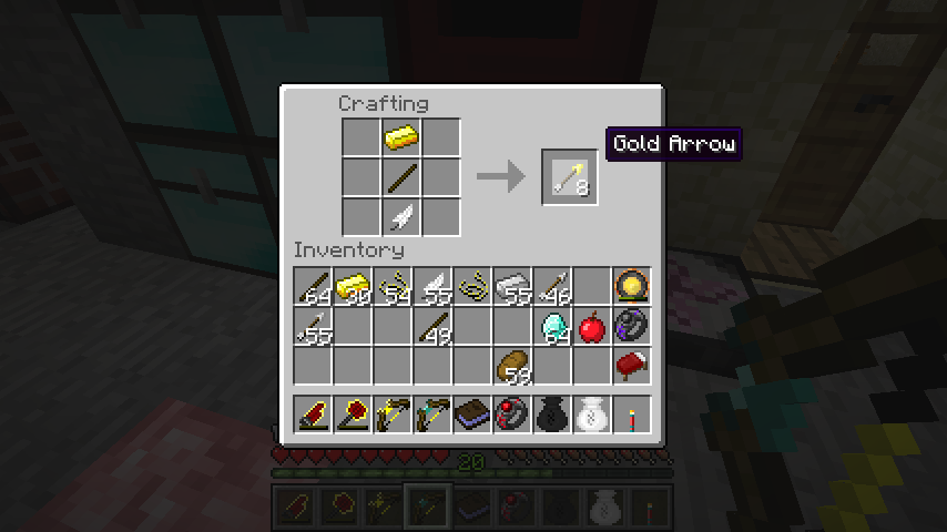金インゴット、鍛えた棒、羽根で金の矢(Gold Arrow)*8。