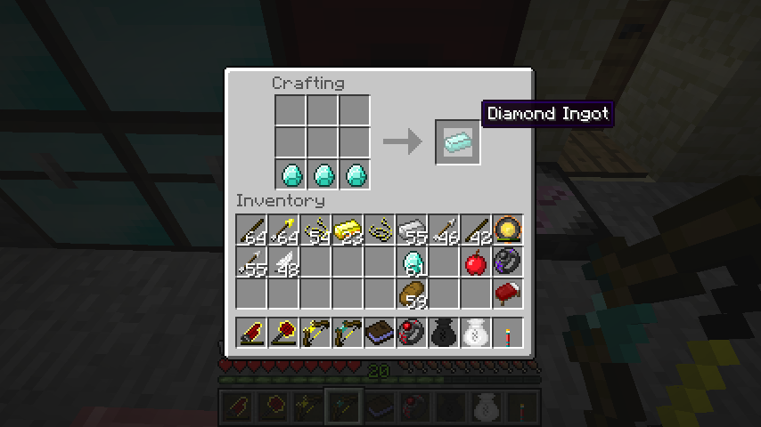 ダイヤの矢だけ作成が一段階多く、ダイヤモンド*3でダイヤモンドインゴット(Diamond Ingot)。ダイヤモンドインゴット、鍛えた棒、羽根でダイヤの矢(Diamond Arrow)*24。