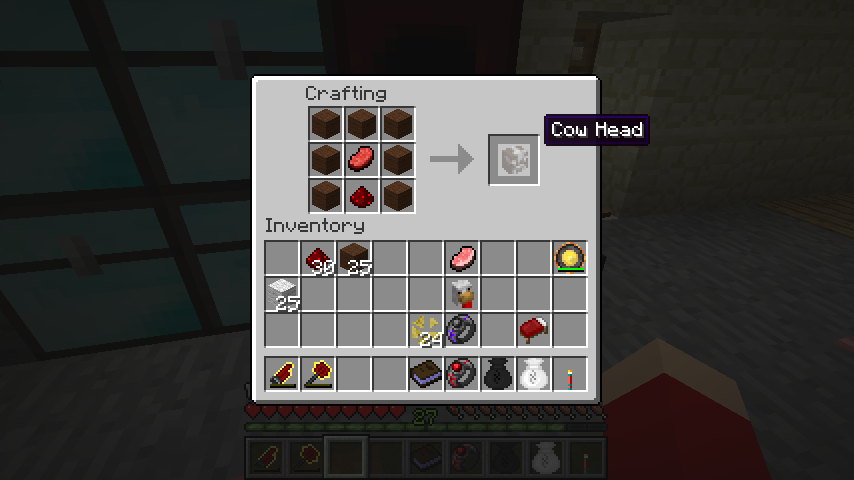 茶羊毛*7、レッドストーン、生牛肉で牛の頭(Cow Head)。