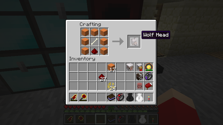 オレンジ羊毛*7、レッドストーン、骨で狼の頭(Wolf Head)。