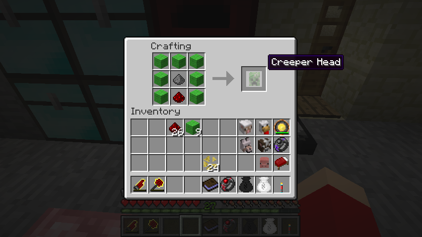 ライム羊毛*7、レッドストーン、火薬でクリーパーの頭(Creeper Head)。