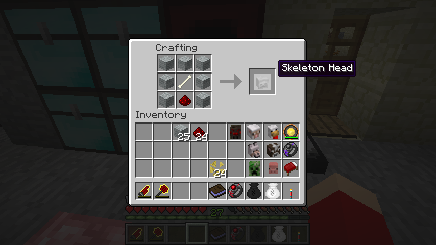 ライトグレー羊毛*7、レッドストーン、骨でスケルトンの頭(Skeleton Head)。