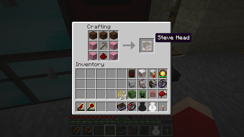 茶羊毛*3、ピンク羊毛*4、レッドストーン、石ピッケルでスティーブの頭(Steve Head)。