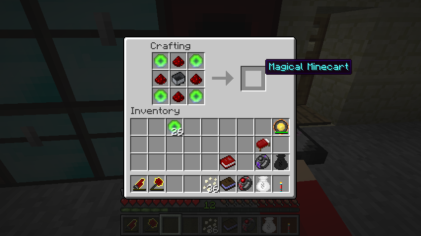 マインカート、レッドストーン*4、経験値オーブ*4でマジカルマインカート(Magical Minecart)。