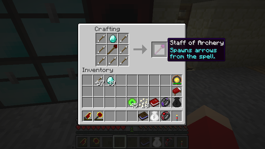 弓術の杖*3、ダイヤモンド*3、矢*3でアローシャワーの杖(Staff of Arrow Shower)。