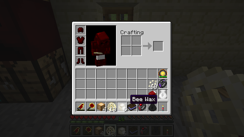 蜂の巣は一旦設置して叩き壊すと巣板(Honey Comb)になり、巣板を手に持って右クリックすると蜜蝋(Bee Wax)になります。