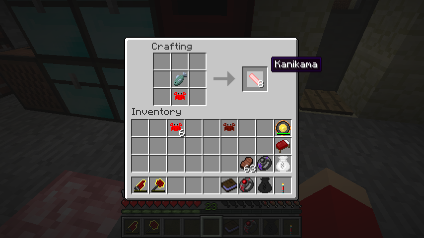 生蟹、生魚でカニかま(Kanikama)*8、満腹度回復量0.5。