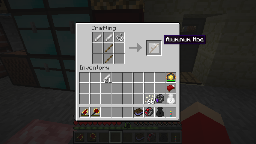 木の棒*2、アルミ棒*2、糸でアルミの鍬(Aluminum Hoe)。