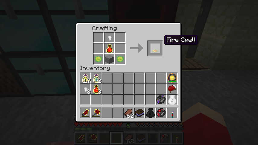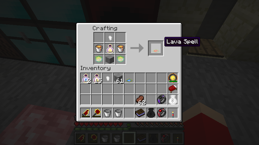 鉄塊、大経験値ボトル、焼石、マジックパウダー*2、溶岩バケツ*2で溶岩の魔法(Lava Spell)。