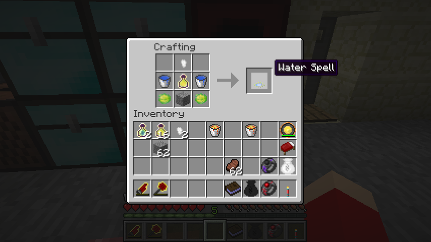 鉄塊、大経験値ボトル、焼石、マジックパウダー*2、水バケツ*2で水の魔法(Water Spell)。