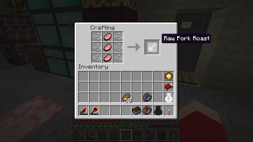 生豚肉*3、糸*6で生ローストポーク(Raw Pork Roast)、それを焼くとローストポーク(Roast Pork)。