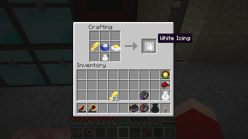牛乳入りピッチャー、バター、粉砂糖、割った卵で白い糖衣(White Icing)。
