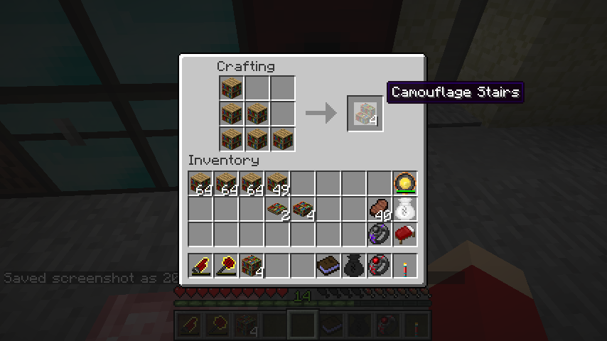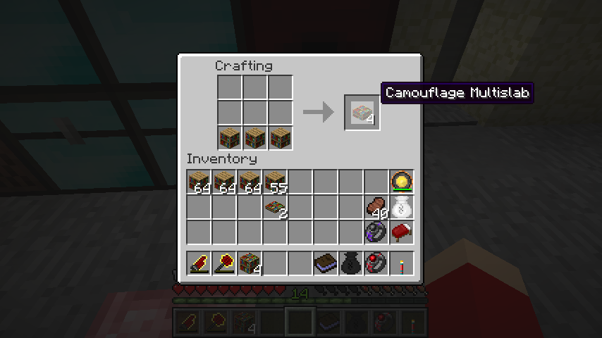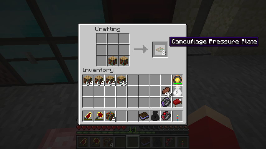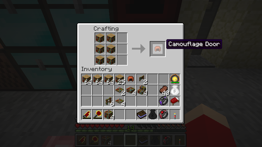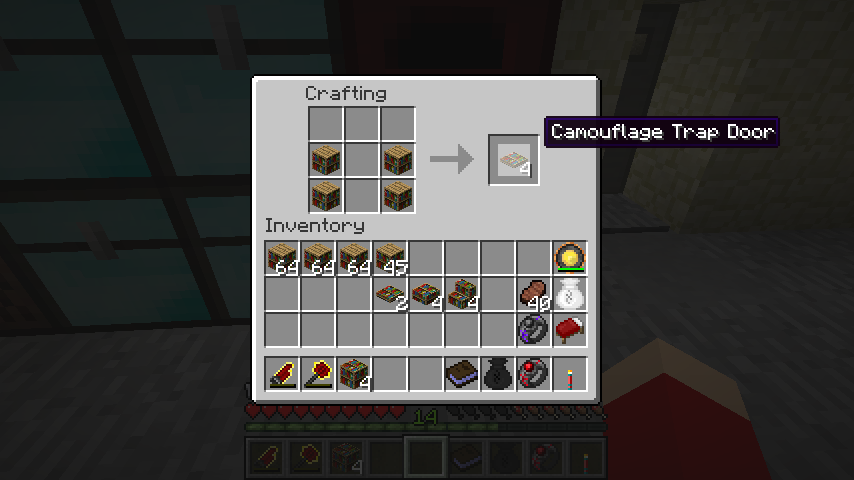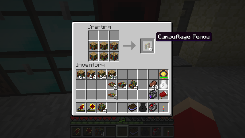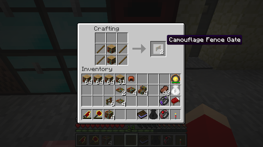 カモフラージュ感圧板、カモフラージュ半ブロック、カモフラージュトラップドア、カモフラージュフェンス、カモフラージュフェンスゲート、カモフラージュドアがバニラと同じレシピで作成可能です。