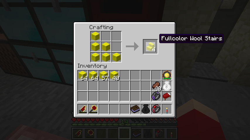 見た目や機能は普通の階段、半ブロック、カーペットと同じで、見た目だけが任意の羊毛色になります。