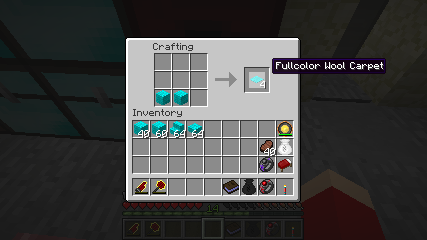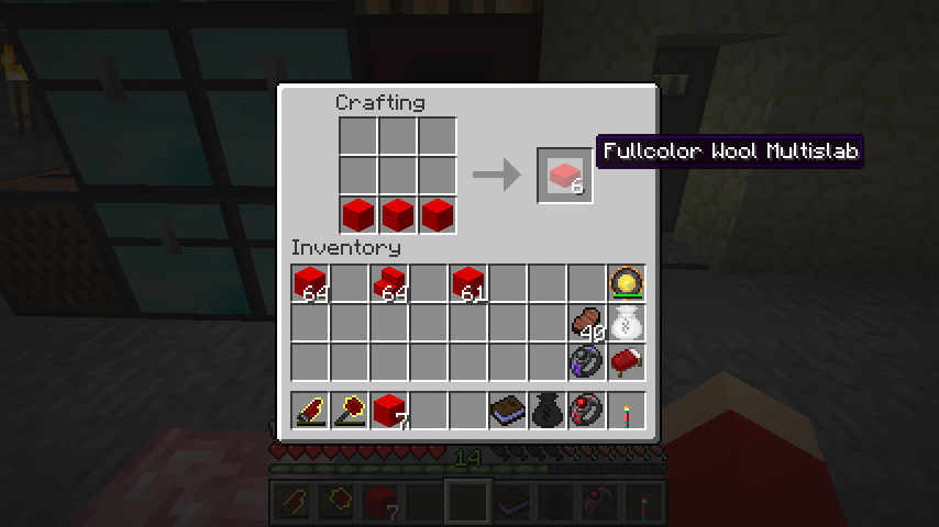 フルカラー羊毛からはフルカラー羊毛階段(Fullcolor Wool Stairs)、フルカラー羊毛半ブロック(Fullcolor Wool Multislab)、フルカラー羊毛カーペット(Fullcolor Wool Carpet)を作成可能です。