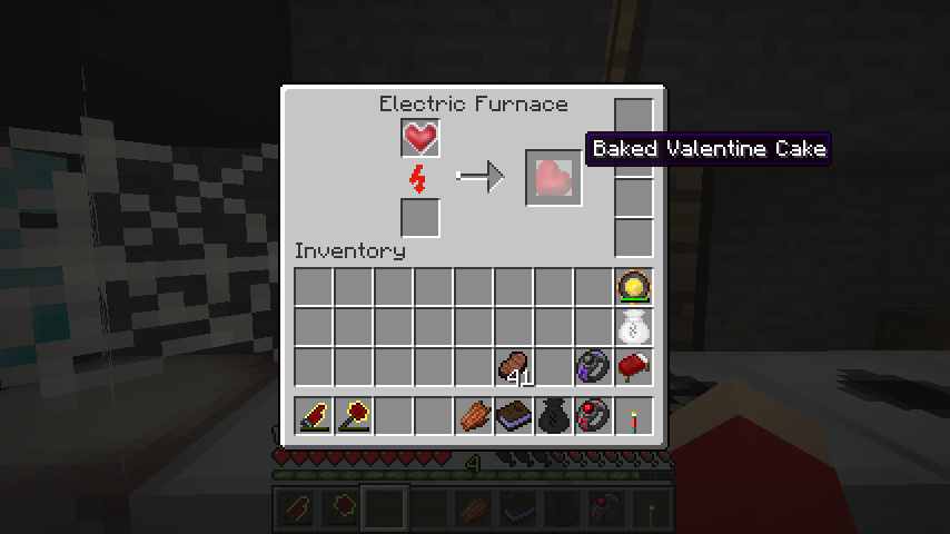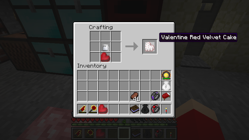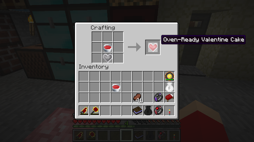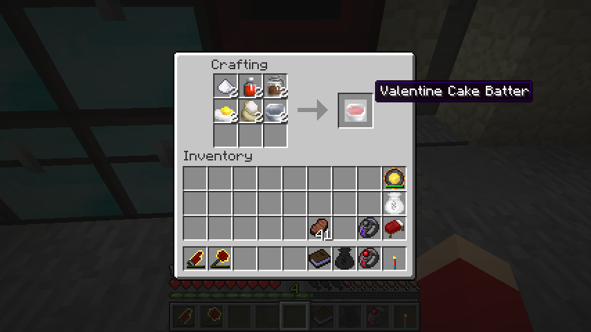 砂糖、赤い食用色素、チョコシロップ、割った卵、小麦サック、アルミのボウルでバレンタインケーキの生地(Valentine Cake Batter)