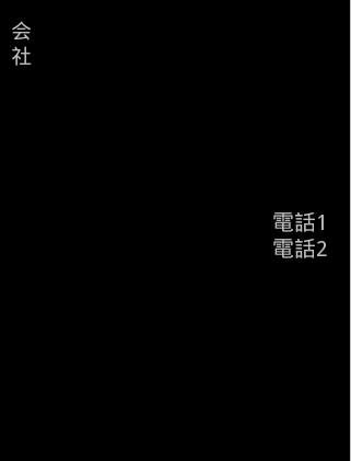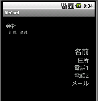 <?xml version="1.0" encoding="utf-8"?> <LinearLayout xmlns:android="http://schemas.android.com/apk/res/android" android:orientation="vertical" android:layout_width="fill_parent" android:layout_height="fill_parent"> <LinearLayout android:orientation="vertical" android:layout_marginLeft="10dip" android:layout_marginTop="20dip" android:layout_width="wrap_content" android:layout_height="wrap_content"> <!-- 会社名 --> <TextView android:id="@+id/companyNameLabel" android:text="@string/company_name" android:textSize="19dip" android:layout_width="fill_parent" android:layout_height="wrap_content" /> <LinearLayout android:orientation="horizontal" android:layout_width="fill_parent" android:layout_height="wrap_content"> <!-- 組織名 --> <TextView android:id="@+id/organizationNameLabel" android:text="@string/organization_name" android:layout_marginLeft="10dip" android:layout_width="wrap_content" android:layout_height="wrap_content" /> <!-- 役職名 --> <TextView android:id="@+id/positionNameLabel" android:text="@string/position_name" android:layout_marginLeft="10dip" android:layout_width="wrap_content" android:layout_height="wrap_content" /> </LinearLayout> </LinearLayout> <LinearLayout android:orientation="vertical" android:layout_marginTop="40dip" android:layout_marginRight="20dip" android:layout_width="fill_parent" android:layout_height="wrap_content"> <!-- 人名 --> <TextView android:id="@+id/personNameLabel" android:text="@string/person_name" android:textSize="25dip" android:gravity="right" android:layout_width="fill_parent" android:layout_height="wrap_content" /> <!-- 住所 --> <TextView android:id="@+id/addressLabel" android:text="@string/address" android:textSize="20dip" android:layout_marginLeft="10dip" android:gravity="right" android:layout_width="fill_parent" android:layout_height="wrap_content" /> <!-- 電話1 --> <TextView android:id="@+id/tel1Label" android:text="@string/tel1" android:autoLink="phone" android:textSize="20dip" android:gravity="right" android:layout_width="fill_parent" android:layout_height="wrap_content" /> <!-- 電話2 --> <TextView android:id="@+id/tel2Label" android:text="@string/tel2" android:autoLink="phone" android:gravity="right" android:textSize="20dip" android:layout_width="fill_parent" android:layout_height="wrap_content" /> <!-- メール --> <TextView android:id="@+id/mailLabel" android:text="@string/mail" android:autoLink="email" android:textSize="20dip" android:gravity="right" android:layout_width="fill_parent" android:layout_height="wrap_content" /> </LinearLayout> </LinearLayout>