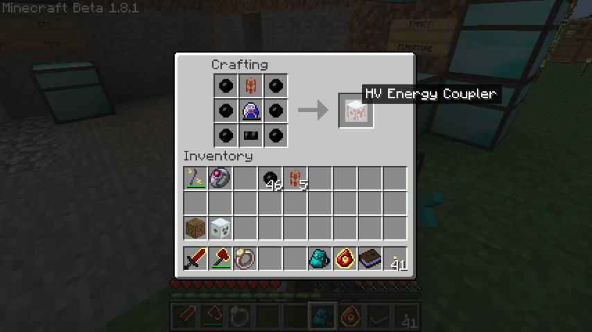 高圧エネルギー連結器(HV Energy Coupler)はゴム*6、木エネルギーパイプ、ラポトロンクリスタル、精錬鉄ケーブル。