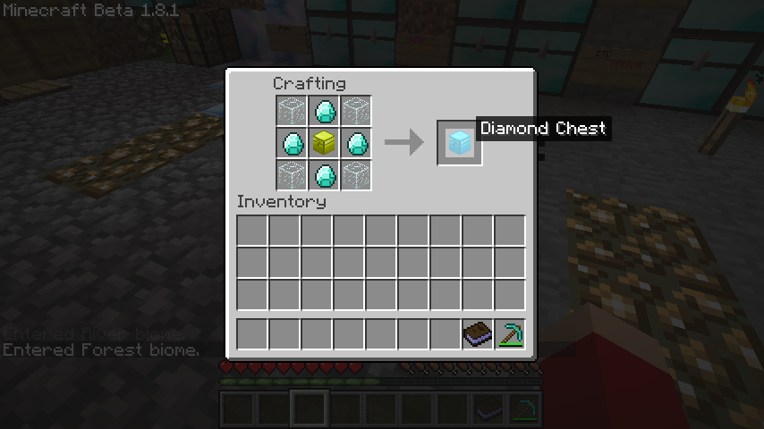 チェスト+鉄インゴット*7で鉄チェスト(Iron Chest)、鉄チェスト+金インゴット*7で金チェスト(Gold Chest)、金チェスト+ダイヤモンド*4+ガラス*4でダイヤモンドチェスト(Diamond Chest)になります。