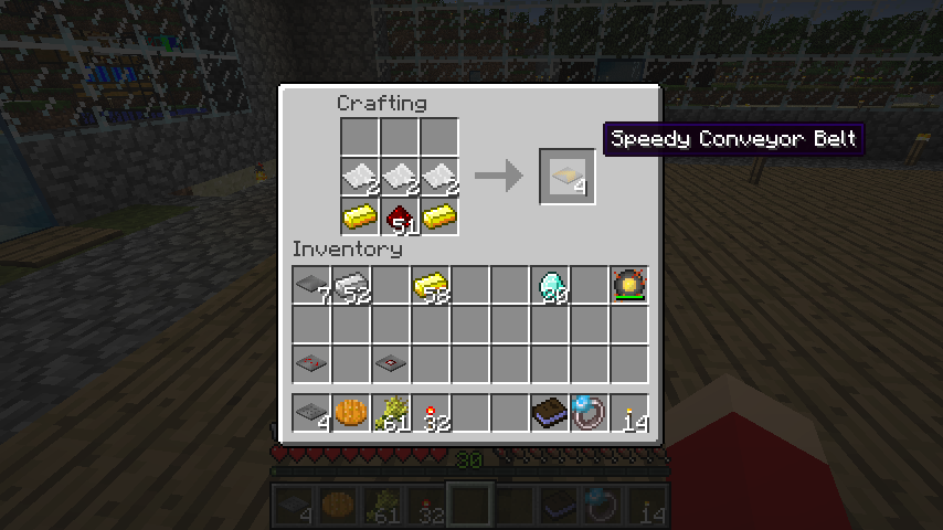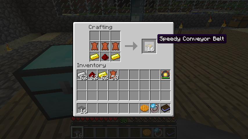 ハイスピードベルト(Speedy Conveyor Belt)は皮*3、金インゴット*2、レッドストーン*1。