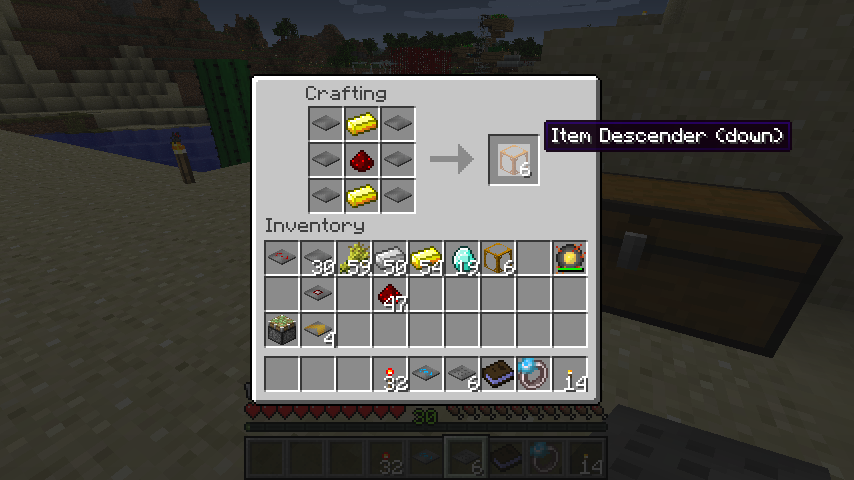 下降エレベータ(Item Descender (down))はコンベアベルト*6、金インゴット*2、レッドストーン。