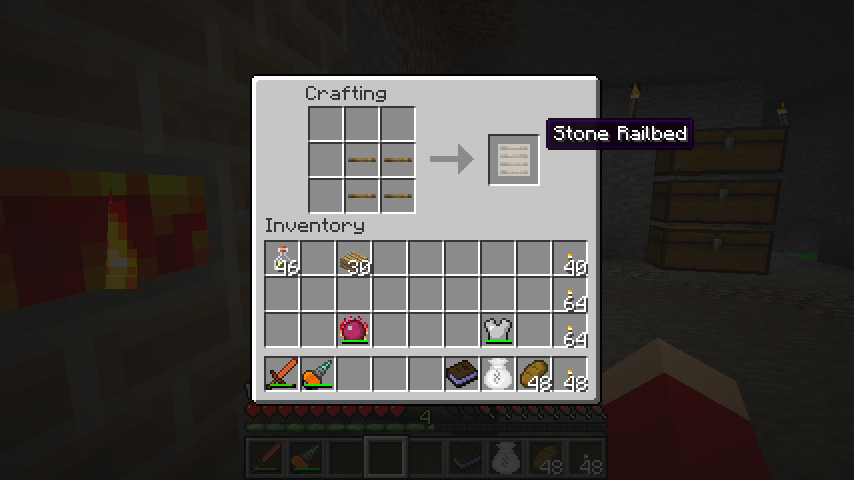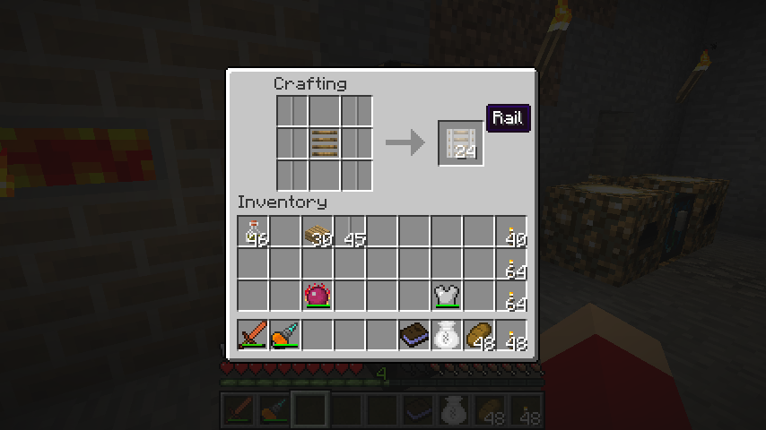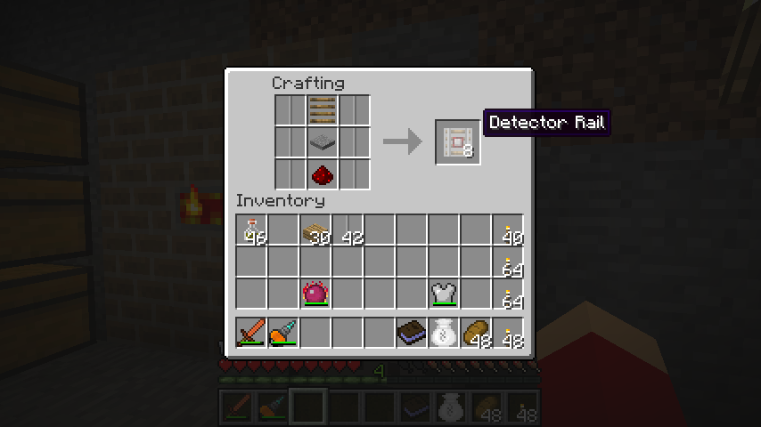 標準レール、木の枕木、石の感圧板、レッドストーンでディテクターレール(Detector Rail)です。