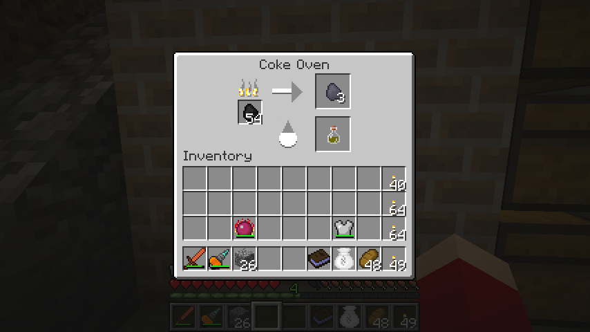 右クリックで中が開き、石炭を投入するとゆっくり時間をかけてコークス(Cole Coke)およびクレオソート油(Creosote Oil)を産出します。