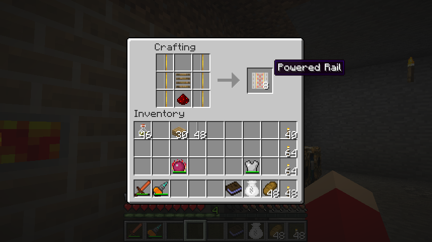 金プレートレール*6、木の枕木、レッドストーンでブースターレール(Powered Rail)。