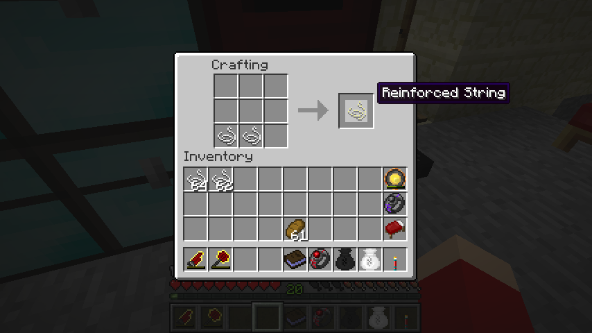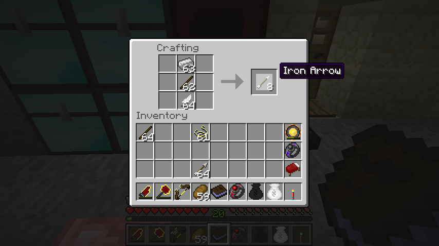 鉄インゴット、鍛えた棒、羽根で鉄の矢(Iron Arrow)*8。