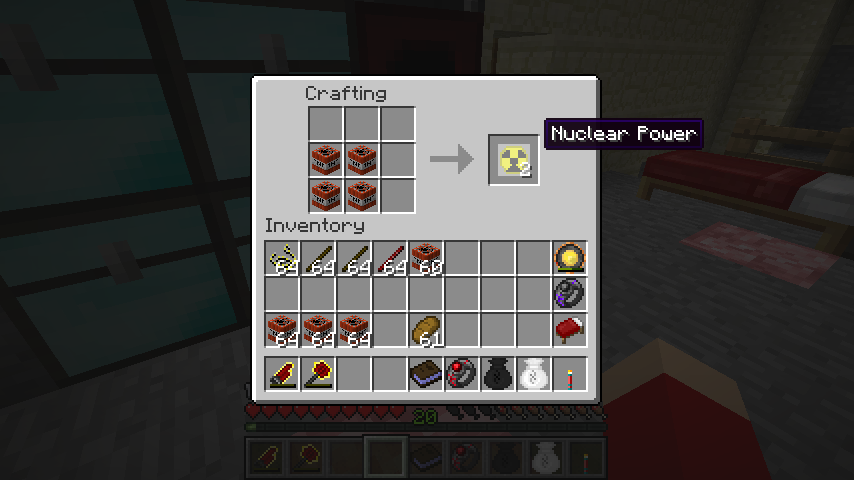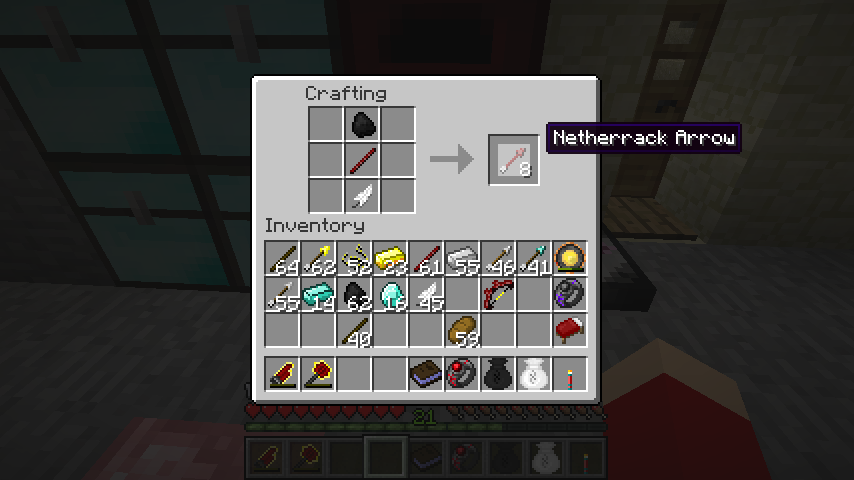 石炭、ネザーラック棒、羽根でネザーラックの矢(Netherrack Arrow)*8。