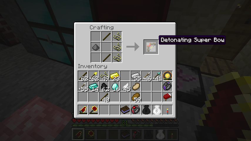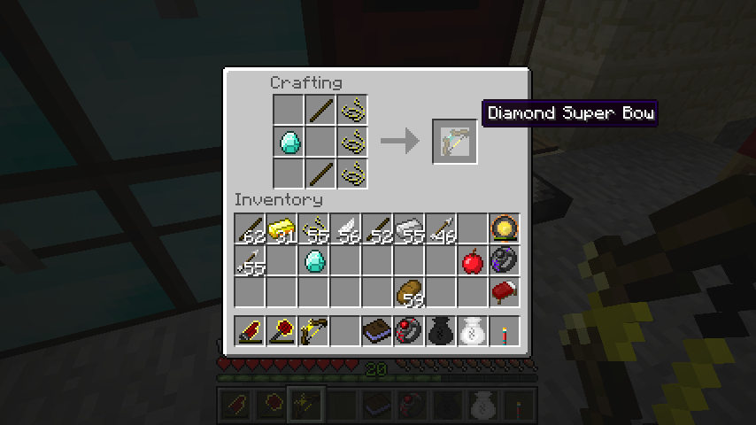 ダイヤモンド、鍛えた棒*2、強化糸*3でダイヤの弓(Diamond Super Bow)。