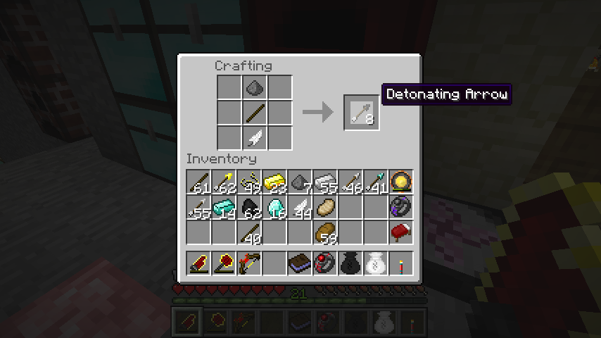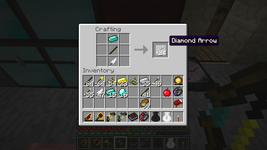 ダイヤの矢だけ作成が一段階多く、ダイヤモンド*3でダイヤモンドインゴット(Diamond Ingot)。ダイヤモンドインゴット、鍛えた棒、羽根でダイヤの矢(Diamond Arrow)*24。