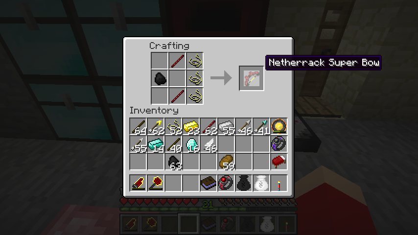 石炭、ネザーラック棒*2、強化糸*3でネザーラックの弓(Netherrach Super Bow)。