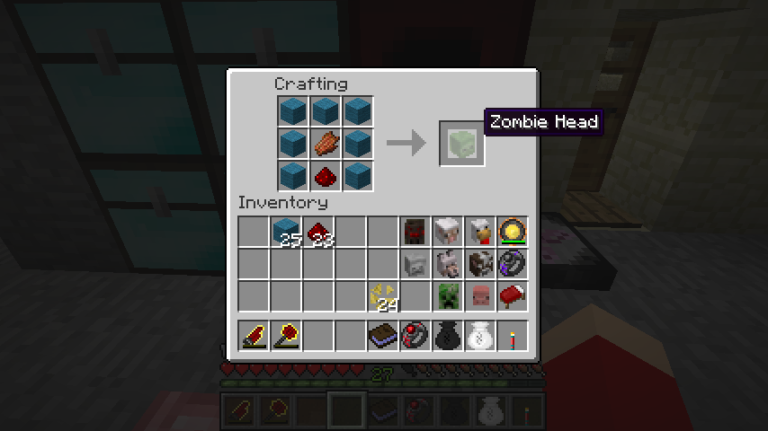 シアン羊毛*7、レッドストーン、ゾンビ肉でゾンビの頭(Zombie Head)。