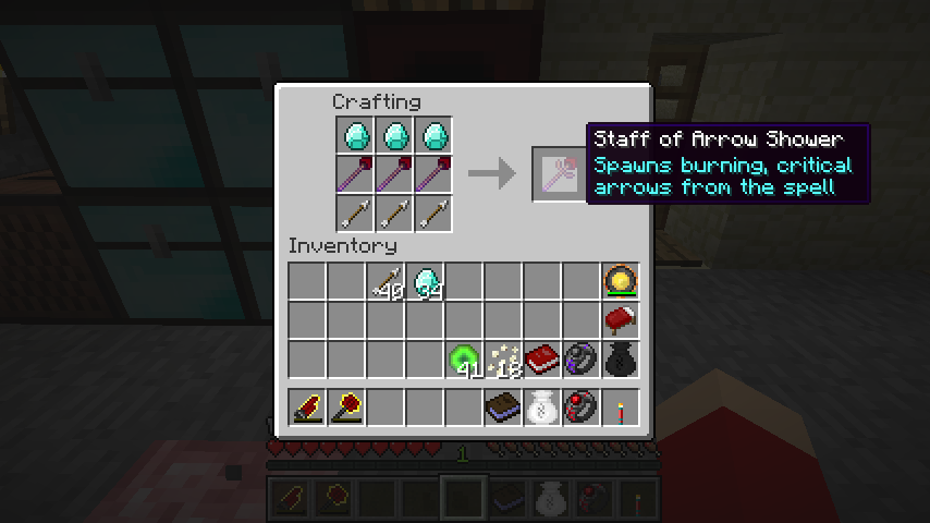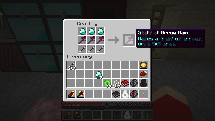 弓術の杖*3、ダイヤモンド*3、矢*3でアローシャワーの杖(Staff of Arrow Shower)。
