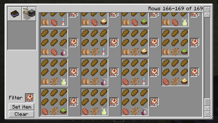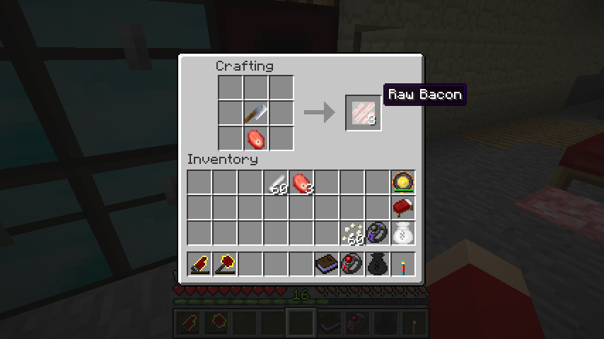 ハムステーキと小間切り包丁で生ベーコン(Raw Bacon)*3、満腹度回復量0.5。