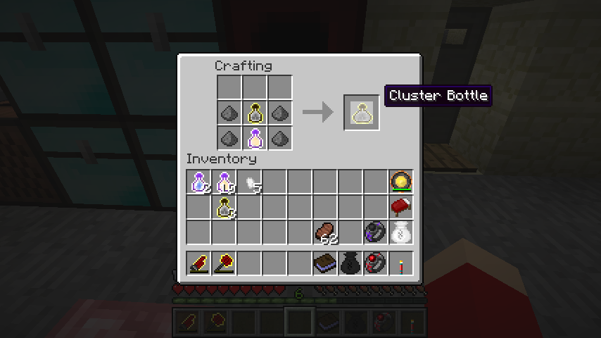 大経験値ボトル、TNTボトル、火薬*4でクラスターボトル(Cluster Bottle)。