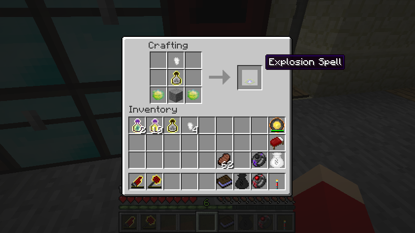 鉄塊、TNTボトル、焼石、マジックパウダー*2で爆発の魔法(Explosion Spell)。